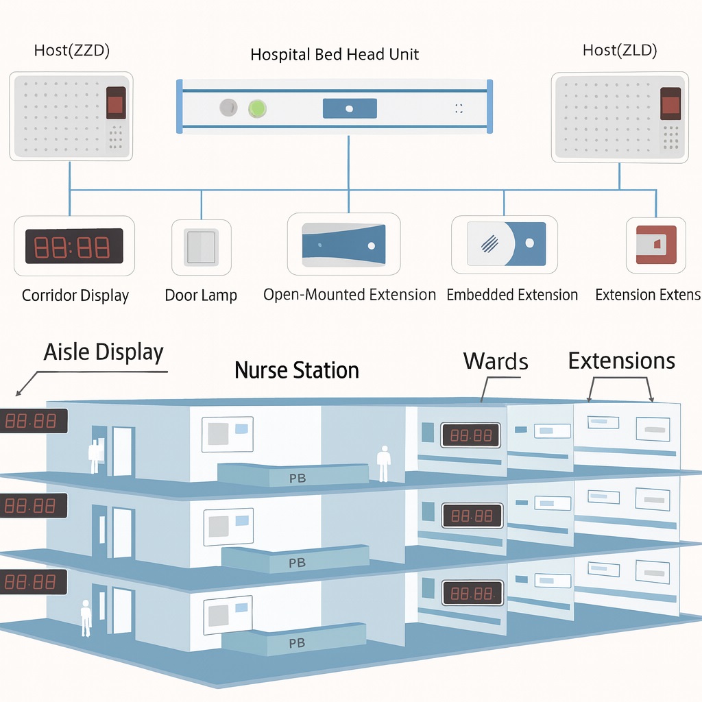 - Bed Extension Units: Located securely at each patient’s bedside, this is the patient’s primary interface with the care team. It typically houses a prominent, easy-to-press call button and may include a handset for direct, private conversation with the nurse station. Some advanced models feature a built-in night light for patient comfort or a local cancel button for the patient to use if a need resolves spontaneously.
